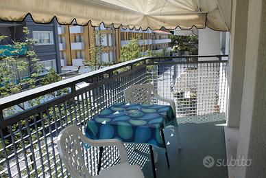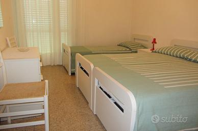 Lignano Sabbiadoro, centralissimo viale Venezia a 3 minuti dalla spiaggia, gestione familiare, spaziosi appartamenti con soggiorno più cucinino o cucina abitabile, due camere matrimoniali più letto singolo (totale 5, oppure 6 posti letto), bagno con box doccia, ampio terrazzino autonomo, aria condizionata, lavatrice, Tv, forno microonde, posto auto riservato e custodito.
