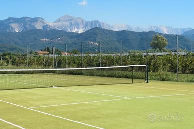 L'appartamento con piscina e campo da tennis si trova ad Ameglia in via ca del sale n.9 vicino al mare di Bocca di Magra e Fiumaretta distanza meno di 3 km , in macchina occorrono 5 minuti, Ad uso privato avrete un ampio giardino attrezzato con tavoli sedie e lettini prendisole e barbecue, inoltre sono presenti WiFI, parcheggio privato adiacente alla casa e aria condizionata. È composto da un piano terra con un cucinino attrezzato, un grande soggiorno con 2 divani letto singoli, 2 divani e zona pranzo, un piccolo bagno di servizio con lavatrice, doccia, lavabo water senza bidet mentre al piano superiore vi sono due camere da letto di cui una matrimoniale e una doppia e un grande bagno completo di tutto, per un totale di 6 posti letto. L'intera casa è fornita di asciugamani da bagno e biancheria da letto e cucina con cambio settimanale. La piscina e il campo da tennis sono per la maggior parte della giornata pressoché ad uso esclusivo. Sono i benvenuti i vostri animali purché siano ubbidienti e non aggressivi perché la casa non è recintata ma i pericoli sono praticamente nulli. La vacanza è improntata sulla natura tranquillità e a due passi dalle maggiori e più famose zone turistiche come Cinque Terre Versilia Golfo dei Poeti Alpi Apuane Lunigiana Portovenere Lerici e molte altre. Vi aspettiamo