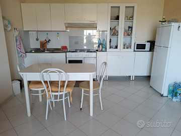 L'appartamento ha esposizione su 2 lati (est e sud-est), entrambi con balcone. Il soggiorno immette su terrazzina coperta, dotata di tavolo e sedie, con vista diretta di spiaggia e mare (distante in linea d'aria 50 mt).