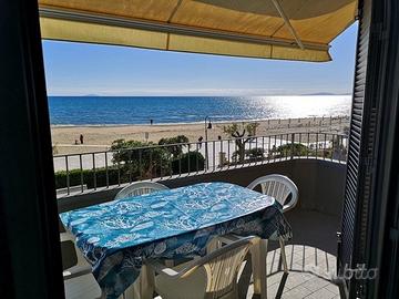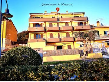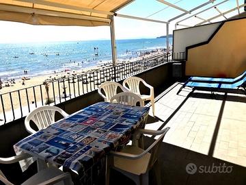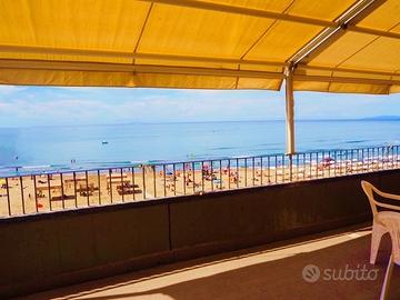Prenotazioni 2026 - lungomare pedonale di via Roma, per vacanze - in PRIMA FILA al mare, anche nei "ponti" di Pasqua, 25 aprile e 1° maggio; bilocale 2/4 p.letto (con bella terrazza abitabile sul mare) facente parte di una palazzina con 8 unità, di varie tipologie, 3 piani con ASCENSORE, che affittiamo in ESCLUSIVA per vacanze, anche settimanali; ci sono bi e trilocali fino a un max di 6 p.letto, tutti con affaccio sulla spiaggia e spazi vivibili attrezzati, tra cui un piano terra con corte esclusiva fronte spiaggia e ingresso indipendente e un bellissimo ATTICO con terrazza di 40 mq.; tutti dotati di: lavatrice, (alcuni anche lavastoviglie e p.cottura a induzione) frigo con congelatore, tv, forno. CLIMA in tutti i locali, WIFI; sono presenti 2 autoclavi, indispensabili per l'erogazione costante di acqua. Animali ammessi su richiesta. Possibilità posto auto coperto e chiuso o anche box garage, su prenotazione, a c.a 500 mt. da casa; La posizione è eccezionale e unica, comoda e centralissima. Davanti a casa si trova sia spiaggia libera che attrezzata. Pagamenti anche con carta di credito. tariffe All inclusive alla consegna delle chiavi. Le foto sono afferenti, oltre al bilocale, anche agli altri appartamenti. Prenotazioni 2026 aperte. Disponibilità: Immobiliare P.M. chiamando al nr.