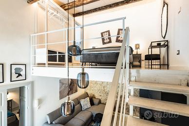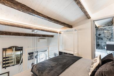 Il soppalco luminoso ospita un letto matrimoniale e un bagno aggiuntivo, garantendo privacy e comfort per tutti gli ospiti.