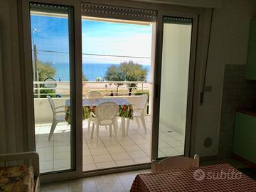 Appartamento a 4 posti letto con camera matrimoniale, cucina soggiorno con divano a due letti, bagno, terrazzo fronte mare attrezzato per pranzo soggiorno all'aperto, posto auto riservato, cantina ripostiglio, lavatrice, asse e ferro da stiro, tv, cassetta di sicurezza e Wi-Fi compresi nel prezzo.