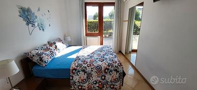 Appartamento piano terra di 50 mq con ingresso su corte esclusiva attrezzata per mangiare all'aperto, soggiorno con divano letto, angolo cottura, camera matrimoniale con uscita su ulteriore corte esclusiva lato ovest (verso ferrovia) e bagno finestrato con doccia. Posto riservato scoperto.