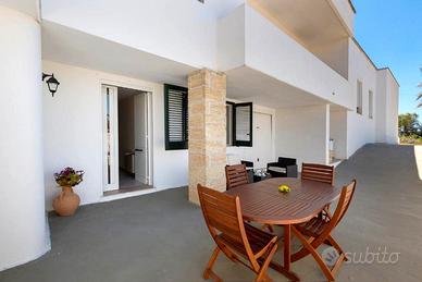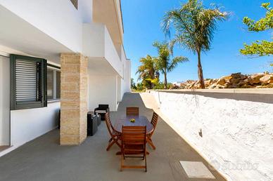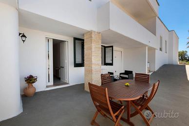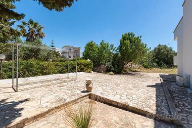 Grazioso e ben curato appartamento, piano leggermente terra, all'interno di una villetta bifamiliare, con giardino e spazi esterni propri, posto nel cuore di Torre Suda , in via Orties, a 150m dai servizi, 200m dallo scoglio e 4km dalle spiagge di Gallipoli.