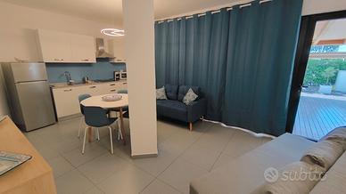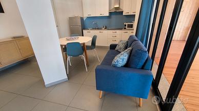 Moderno monolocale per 3 persone con ampio soggiorno, divano letto matrimoniale, angolo cottura a induzione e bagno con doccia. Terrazzo esterno di circa 20 mq attrezzato. Dotazioni: TV, internet Wi-Fi, lavatrice, aria condizionata, macchina da caffè a capsule, microonde e posto auto riservato.