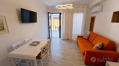 Spazioso trilocale per 6 persone con due camere matrimoniali, soggiorno con angolo cottura a induzione e due poltrone letto, bagno con doccia, terrazzo di circa 80 mq. Dotazioni: TV in tutte le stanze, internet Wi-Fi, lavatrice, lavastoviglie, aria condizionata, macchina da caffè a capsule e posto auto riservato.