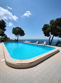 Monolocale ad Acciaroli loc. Mezzatorre da poco ristrutturata, con vista mare a 360°, in parco privato con custode e piscina riservata ai condomini. Dotata di ampio terrazzo ventilato, con ulivo centenario unico (fresco anche nei giorni estivi più caldi). Doccia anche esterna (calda). La struttura è composta da camera da letto, bagno e angolo cottura. Vista mare eccezionale. La struttura dista soltanto 3 curve dal mare e circa 2km o dieci minuti da Acciaroli e da Agnone. Parcheggio libero nel parco. Entrata dal giardino in comune con l'appartamento indipendente nel piano superiore. 2 adulti + CULLA DISPONIBILE