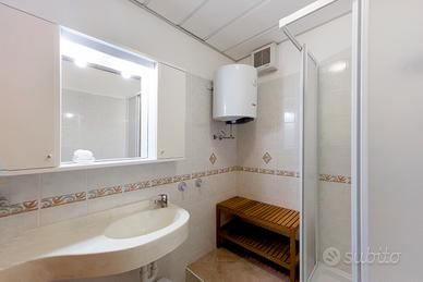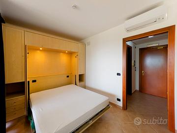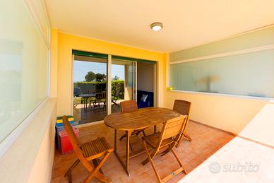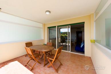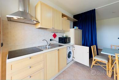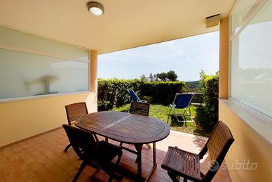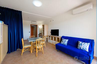 L'appartamento di circa 40 mq è composto da soggiorno con angolo cottura, letto matrimoniale a scomparsa e divano letto matrimoniale; bagno con doccia. A completare l'appartamento un giardino attrezzato con tavolo e sedie da cui si intravede il mare. Tra i servizi disponibili ci sono tv, aria condizionata, lavatrice, parcheggio privato incluso, barbecue e piscina condominiale.