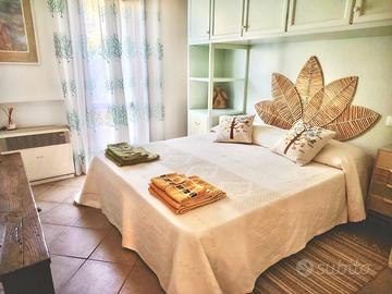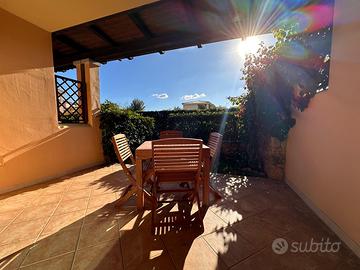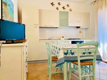 Bilocale completamente arredato, giardino fronte e retro recintato, aria condizionata, lavatrice, bagno con box doccia. Terrazza coperta con tavoli e sedie, piscina condominiale e posto auto coperto riservato.