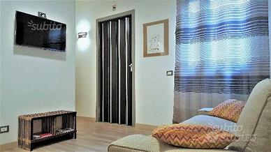Una zona Pranzo/Living Climatizzata, un comodo divano e una Smart TV flat Lcd, una Camera da letto con cabina spogliatoio, un Bagno privato con doccia dotato di phon a parete e una Cucina moderna totalmente attrezzata e corredata di Set completi di pentole, piatti e posate per preparare e servire a tavola.