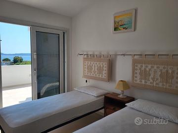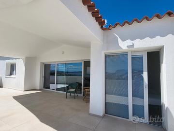 Attico panoramico nuovo con ampia terrazza e vista mare eccezionale. 2 camere, 2 bagni, soggiorno, ingresso esclusivo, piscina condominiale. Completamente arredato, lavatrice, aria condizionata, posto auto privato. Spiagge raggiungibili a piedi, comodo a trasporti e servizi. Adatto 2 coppie, No animali, no fumatori.