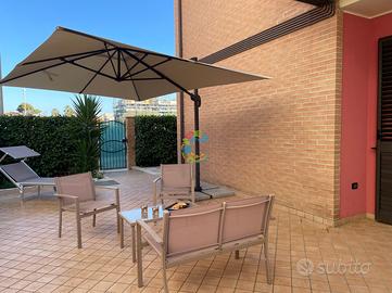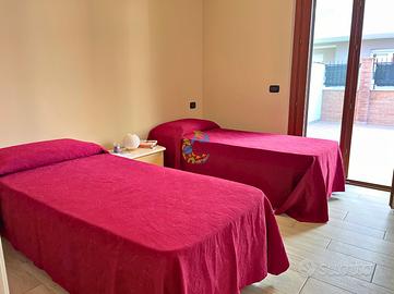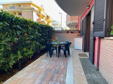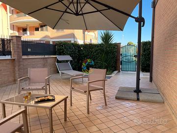 L'appartamento nuovissimo, al piano terra di un elegante condominio posto nel quartiere residenziale nell'area del Borsacchio, a pochi passi dalla via Nazionale, è composto da una zona giorno con angolo cottura e divano letto matrimoniale, camera matrimoniale, cameretta con due letti singoli (che possono essere uniti a matrimoniale), due bagni con doccia (di cui uno cieco), corte esterna attrezzata con tavolo e sedie. Posti letto 6. Arredamento nuovo e confortevole. Aria condizionata, Tv, lavastoviglie, lavatrice, piano cottura. Parcheggio esterno pubblico. Wifi. A circa 1km dalla spiaggia e a circa 800m dal supermercato.