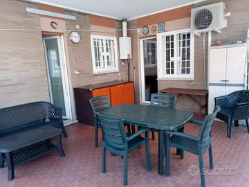 AMPIO SALONE con 2 divani letto matrimoniali, CAMERA LETTO matrimoniale, BAGNO con finestra, CUCINA completa , GRANDE TERRAZZO coperto e tende da sole