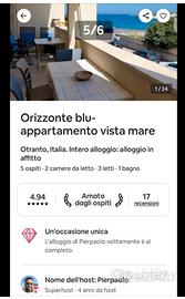 la casa vacanze " orizzonte blu" di Terrazza sul blu, è un appartamento al primo piano, è dotato di due camere, di cui una matrimoniale e una matrimoniale con un letto singolo, per un totale di 5 posti letto, cucinotto, bagno e balcone vista mare. l'appartamento è dotato di aria condizionata nelle camere, lavatrice, ferro da stiro con relativo asse, forno elettrico, forno a microonde e macchinetta del caffè nespresso e Wifi.