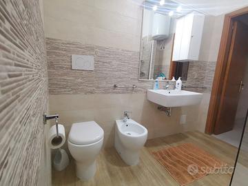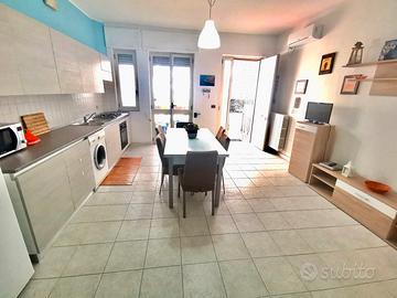 L'appartamento è composto da 2 camere da letto più comodo divano letto matrimoniale situato nella zona giorno (4/6 posti letto), una sala da pranzo molto grande, un bagno e un bellissimo cortile privato (90mq) ad uso esclusivo della casa, recintato ed antistante la struttura, in cui sono sistemati gazebo tavolo, sedie e salottino per fresche cene e relax all'aperto. Box auto chiuso ed Aria Condizionata.