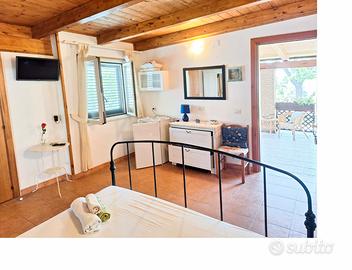 Accogliente cottage senza angolo cottura, ideale per brevi periodi. La struttura è composta da una camera con letto matrimoniale, bagno con cabina doccia, TV e frigorifero. All'esterno, un patio attrezzato permette di godere appieno degli spazi all'aperto, con una vista panoramica su Palinuro. La proprietà include un giardino e un comodo posto auto all'interno, con cancello automatico. Situato a soli 5 minuti a piedi dal centro e a 5 minuti di auto dalle principali spiagge della zona, garantisce una posizione strategica per ogni esigenza.