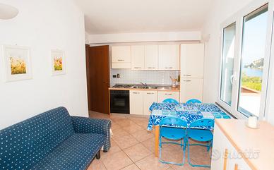 L'appartamento è composto da cucina-soggiorno con divanoletto da una piazza e mezzo, camera con due letti singoli sfalsati a cassetto, camera matrimoniale con balcone vista mare, bagno con doccia, ampio terrazzo vista mare dove poter pranzare e cenare, 1 posto auto all'interno della proprietà.