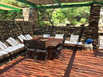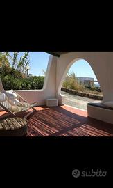 All'esterno sono presenti due ampie verande: una nella parte anteriore con vista sul mare, dotata di tavolo da pranzo e ducchene; un'altra posteriore, più ombreggiata, con sedili e muretti in pietra lavica, ampio tavolo da pranzo, doccia esterna e un piccolo giardinetto.