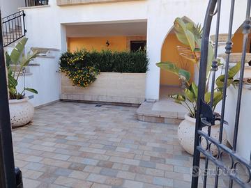 Appartamento al piano terra con ampio cortile antistante e spazio esterno attrezzato composto da 2 camere da letto doppie , un' area giorno soggiorno/cucina con angolo divano letto da 1 piazza e mezza.Puo' ospitare fino ad un massimo di 5/6 persone dista dalla spiaggia appena 250m.dalla spiaggia di Pescoluse e a 100 m dai servizi della Marina.