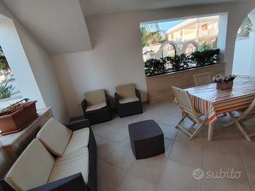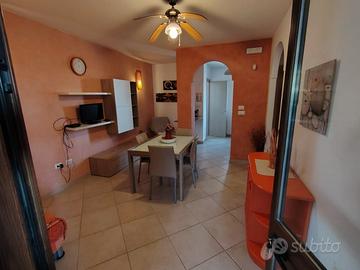 Appartamento al piano terra in un villa residence a 250m dalla spiaggia composto da 2 camere da letto doppie, una cucina/soggiorno con angolo divano letto alla francese , un bagno e un vano biancheria .