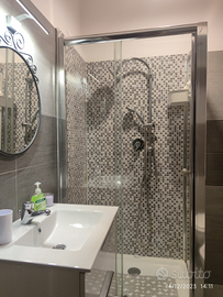 Il bagno è dotato di lavello moderno con cassetti, WC, bidet e doccia con box in cristallo.