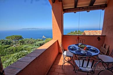 L'appartamento viene raggiunto dopo aver percorso alcune scale. Per mezzo di un piccolo cancello in ferro si accede ad un'ampia terrazza con porticato panoramico munito di tavolo e sedie di fronte all'ingresso dell'abitazione.