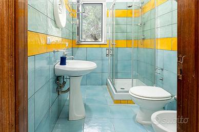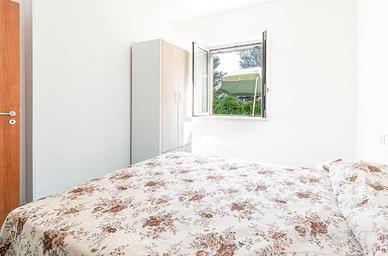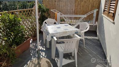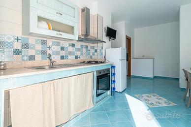 Appartamento bilocale più bagno composto da soggiorno con cucina in muratura, frigorifero, tv, letto singolo. Bagno attrezzato con doccia e lavatrice. Camera da letto con letto matrimoniale, armadio e luminosa finestra. Ampio spazio esterno attrezzato con tavolo, sedie e ombrellone, barbecue in muratura , doccia esterna, lavatoio, giardino, orto e parcheggio privato. La struttura è munita di ARIA CONDIZIONATA (in tutti gli ambienti)