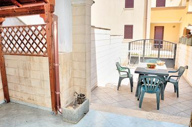 In posizione privilegiata con vista mare, offriamo un appartamento trilocale situato al piano terra di una villetta a schiera, a soli 400 metri dalla spiaggia di Torre Pali, nella marina di Salve.
