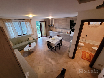 1°Piano- Cucina abitabile con ampio salone e accesso al balcone esterno con vista giardino, e un bagno.