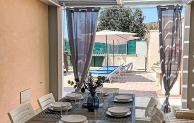 Immersa nel verde dotata di tutti i confort ; sala barbecue, lettini da spiaggia, piscina ,doccia in giardino è gazebo con sala pranzo esterna .