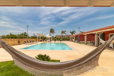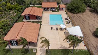 Composto da tre villette da 50mq/cad oltre alla veranda, con piscina comune dotata di idromassaggio e 400mq di solarium, attrezzato con lettini e ombrelloni a disposizione dei villeggianti.