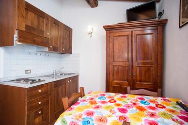 Appartamento monolocale con divano letto matrimoniale, angolo cottura e bagno con doccia.