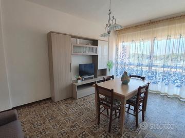 Follonica zona Nuova, via Litoranea 72/74, a 200 metri dal mare. Appartamento trilocale al quarto piano con ascensore con vista mare composto da soggiorno con divano letto a 2 posti, cucinotto con balcone di servizio, camera matrimoniale, camerina con due letti singoli e bagno con la vasca e attacco per la doccia. Tv, lavatrice. Terrazzo abitabile con vista mare, attrezzato per mangiare all'aperto.