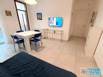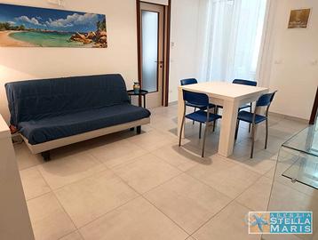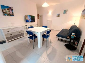 In curato residence con piscina, appartamento al primo piano composto da: soggiorno con divano letto matrimoniale, cucinino, una camera matrimoniale, bagno con finestra e box doccia, terrazzino.