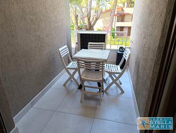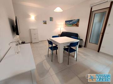In curato residence con piscina, appartamento al primo piano composto da: soggiorno con divano letto matrimoniale, cucinino, una camera matrimoniale, bagno con finestra e box doccia, terrazzino.