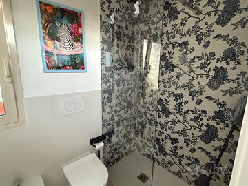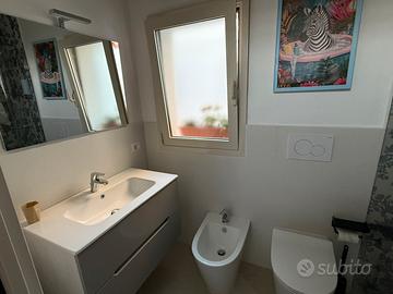 Il bagno è moderno, con doccia, lavandino, WC e bidet.