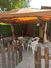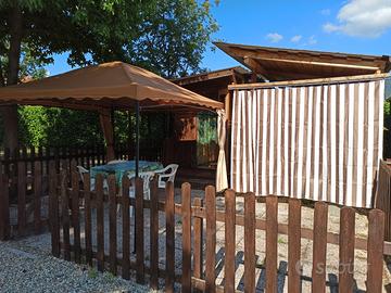 La caravan è coperta da tetto in legno, adiacente c'è una casetta in legno adibita a cucina arredata con lavabo, gas, frigo (completa di utensili per la cucina) tavolo e sedie (che può diventare un altro letto matrimoniale), gazebo esterno con tavolo e sedie.