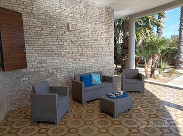 Si affitta settimanalmente villa indipendente a circa 200 m dal mare e dai lidi più rinomati della zona ( lido Bacino Grande, lido BASSAMAREA, lido Hookipa, lido Stella Maris , lido Bahia ed altri), composta da n. 3 camere da letto climatizzate di cui 2 con bagno privato, n.3 bagni totali (completi di doccia), salone, cucina attrezzata, porticato coperto, posto auto privato. La struttura è circondata da un grande giardino di piante esotiche dall' alto fusto e può ospitare fino a MAX 10 persone. È dotata inoltre, di : Wi-Fi, forno a microonde, lavatrice, lavastoviglie, phon in tutti i bagni, asse e ferro da stiro, BBQ e doccia esterna. Servita da Acquedotto Pugliese è in regola con il CIN. Animali ammessi. DISPONIBILITÀ: GIUGNO-LUGLIO -SETTEMBRE