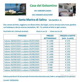 Salina ti aspetta nella Casa del Gelsomino! Situata in zona centrale con terrazza affacciata sul mare, giardino privato, pavimenti e bagni con ceramiche originali di Caltagirone in perfetto stile '800 dipinte a mano, appartata ma a 20 mt dalla via principale ed a soli 60 mt dal mare. Dalla sua terrazza in stile eoliano si gode una splendida veduta del mare e delle isole di Lipari e di Panarea. La casa è composta da grande terrazza, soggiorno che ospita anche un divano letto e una culla. Due camere da letto con ventole al tetto, due bagni con doccia e una grande cucina attrezzata. Piccolo giardino con antico gelsomino arabo, barbecue, lavabo e doccia esterni ed un locale lavanderia. Posti letto 4+2. Animali accettati.