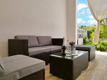 COMPOSIZIONE: soggiorno/sala da pranzo con TV e divano, cucina indipendente attrezzata, bagno appena ristrutturato, 2 camere da letto con 1 letto matrimoniale e 1 letto singolo ciascuna, veranda frontale coperta e attrezzata, cortile posteriore privato con lavatrice, pilozzo, doccia esterna, barbecue e tavolino, giardino frontale con possibilità di PARCHEGGIARE un auto internamente.