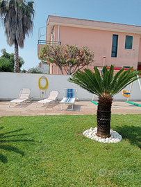 Zona esterna da un giardino di 450 mq con patio e verande, salottino con zona ombreggiante, giardino per il vostro relax dopo il mare con BBQ in muratura ed una doccia esterna con acqua calda , zona lavanderia e parcheggio interno.