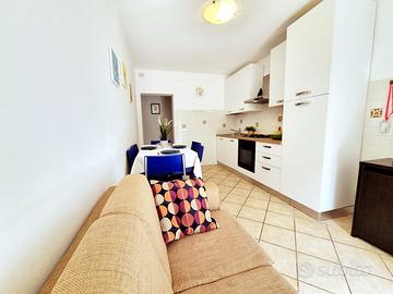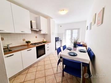ona Conchiglia, a 50 metri dalla spiaggia ed a circa 400 metri dal centro, trilocale piano terreno con accesso diretto da giardino esclusivo attrezzato gazebo per pranzo all'aperto; internamente composto da zona giorno con angolo cottura, due camere matrimoniali con 3 posti letto ciascuna, bagno con doccia, ripostiglio (complessivi 6 PL). Posto auto interno alla proprietà. Appartamento recentemente ristrutturato in perfette condizioni di manutenzione completo di TV, lcd, frigo, lavastoviglie, lavatrice, piccoli utensili da cucina. Disponibile da Maggio a settembre. NON DISPONIBILE 20 GIUGNO - 18 LUGLIO E 8-22 AGOSTO. I prezzi variano a seconda del periodo