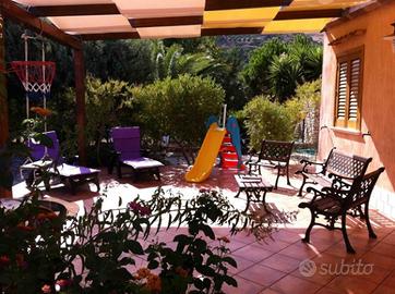 con scivolo ed altalena, e quella posteriore attrezzata con tavolo e poltrone per
