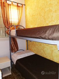Cucina-soggiorno , camera matrimoniale con bagno annesso, una cameretta con letto a castello, veranda con tavolo e sedie..