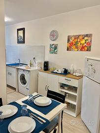 -CUCINA accessoriata piano cottura a gas, forno elettrico, lavandino, pila e lavatrice.