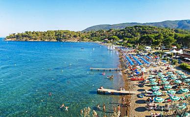La spiaggia si affaccia ad oriente e regala ogni mattina delle albe uniche e suggestive arricchiti dalla vista del paese di Porto Azzurro sullo sfondo.