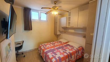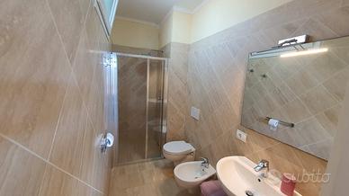 Bagno finestrato, con box doccia e sanitari sospesi. I pavimenti ed il rivestimento del bagno sono in travertino color crema. Aria condizionata e parcheggio privato.