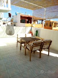 Super Attico al secondo piano con 1 terrazza uso colazione pranzo e cena più 1 terrazza solarium e 2 balconi con vista mare panoramica, cucina con tutto il necessario, zona pranzo, camera matrimoniale più lettino, TV, WIFI, Aria C: fornito di tutta la biancheria più teli mare e ombrello,Dista dalla spiaggia 100 metri, nello stesso raggio Bar e Ristoranti, Alimentari a 50 metri, parcheggio in strada sotto casa gratuito. Giugno 70 a notte,Luglio 90, Agosto 100, Settembre 80, euro 30 pulizie finali.
