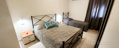 Spaziosa con due camere matrimoniali, la prima ha un letto a castello oltre al letto matrimoniale, la seconda ha un letto singolo oltre al letto matrimoniale, la seconda camera ha il bagno interno mentre il secondo bagno è nel corridoio a disposizione per le altre persone.. in sala abbiamo un comodo divano che all'occorrenza si trasforma in letto matrimoniale.. per un totale di 7 posti letto..