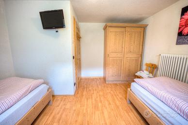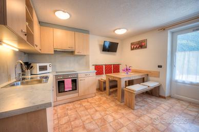 Appartamento al piano terra completamente arredato e provvisto di tutto l' occorrente. Dispone di due stanze, una matrimoniale e una con due letti separati; cucina attrezzata (forno, microonde, tostapane, lavastoviglie, frigo, piccolo congelatore, divano e TV). Wifi gratuito e TV in tutte le camere. Lavatrice, lavabo, asciugacapelli, ferro con asse da stiro. Bagno con doccia e servizi. Giardino e parcheggio privato con deposito sci e biciclette.